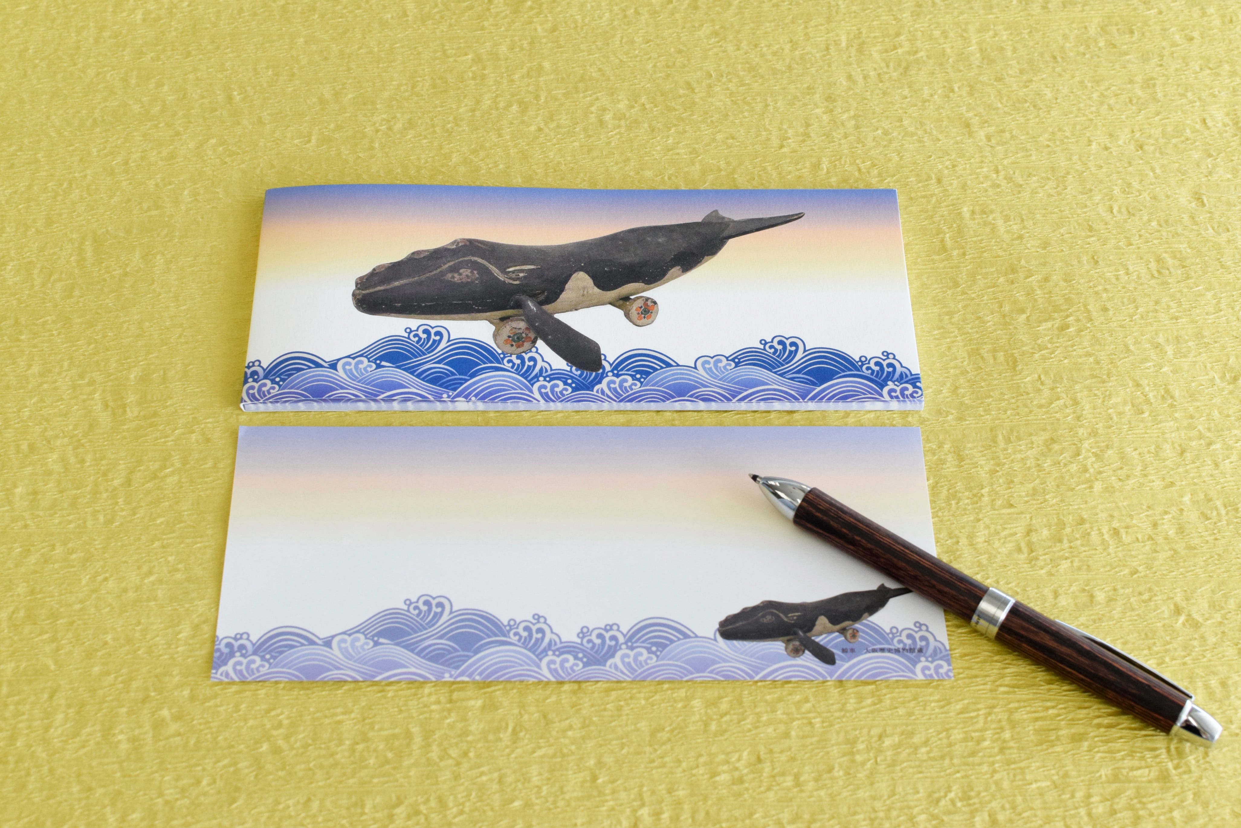 土佐(高知県)の漁師が、久しぶりに会う子どものためにお土産として作ったのが鯨車のはじまりと伝わっています。もともとの木の形を活かしつつ鯨の形に削り、ヒレと車輪を取りつけて色を塗った、素朴ながらもかわいい玩具です。今回は子どもたちの手を離れ、朝焼けの大海原を悠々と泳いでいるところを一筆箋にしてみました。